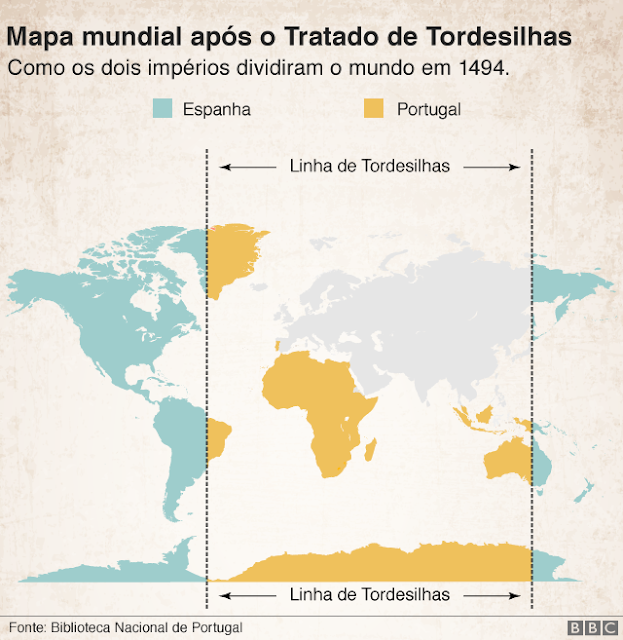 Tratado de Tordesilhas, de 1494, foi assinado por Portugal e Castela (Espanha).
